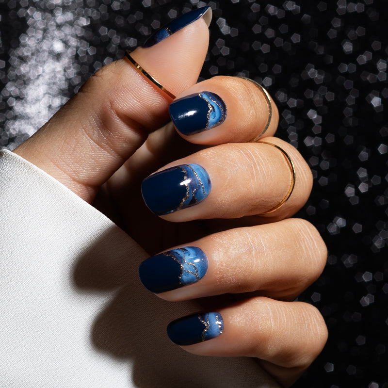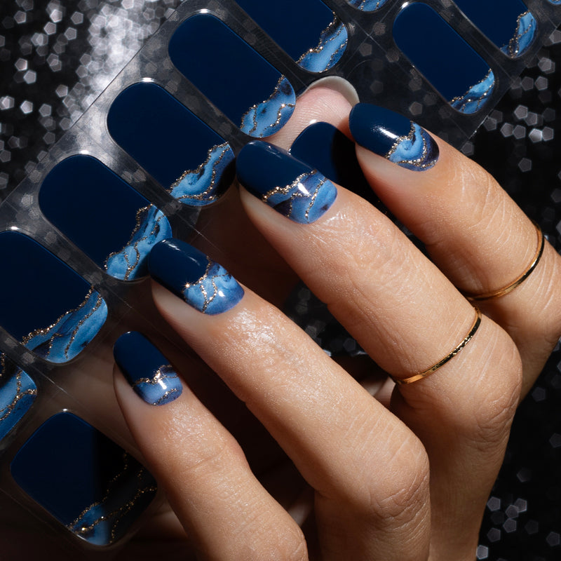 De gelnagel stickers Midnight Wave zijn diep donker blauw. De gellak stickers hebben een blauw marmer detail met gouden glitter lijnen.